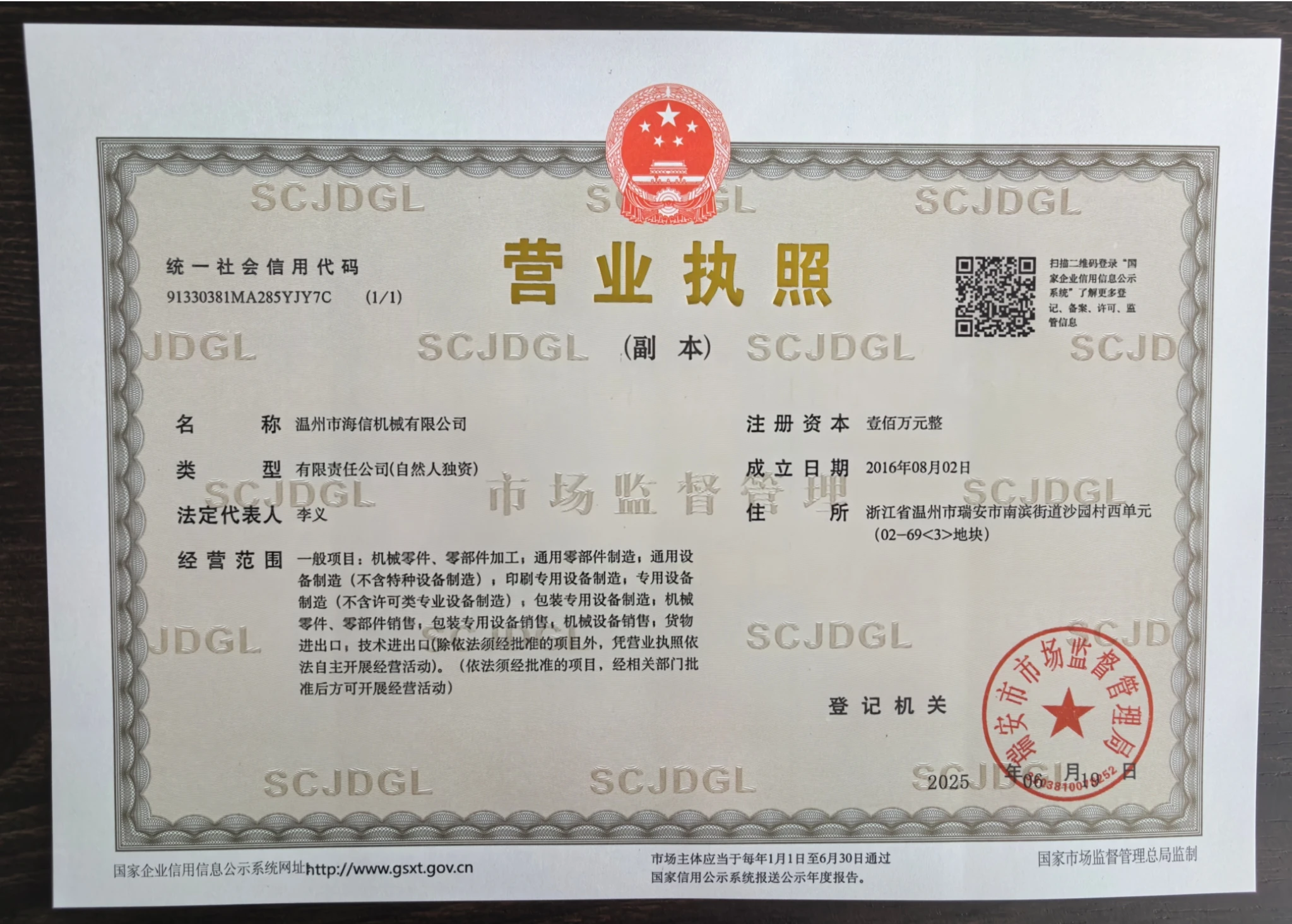 Registered address : West Unit Of Shayuan Village, Nanbin Street, Ruian City (plot 02-69<3>) Wenzhou Zhe'jiang China